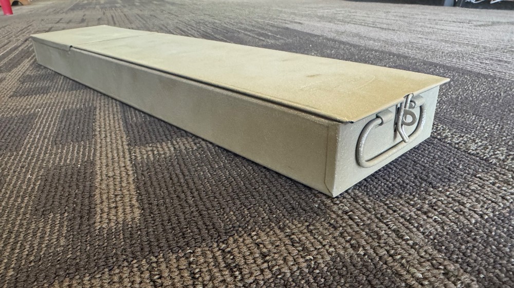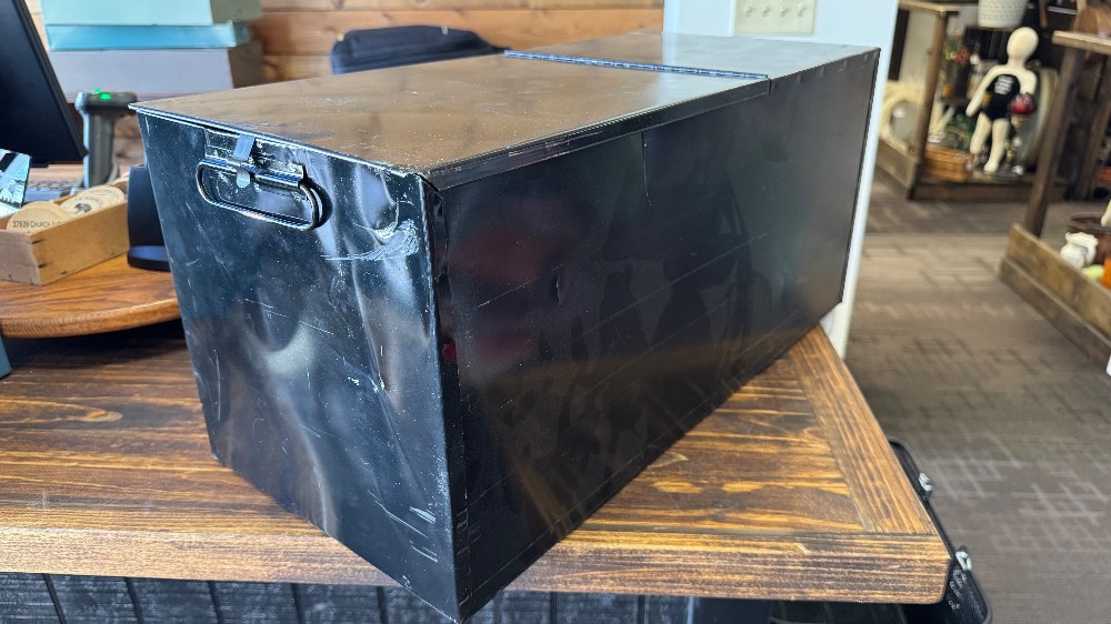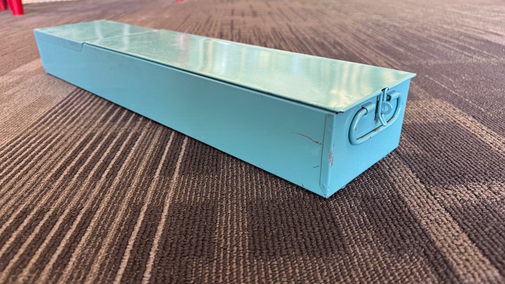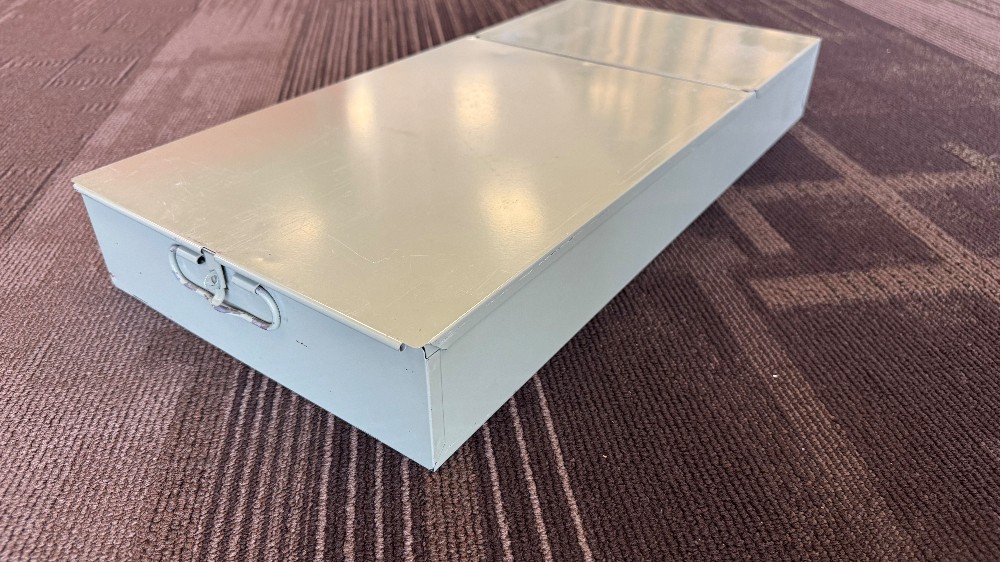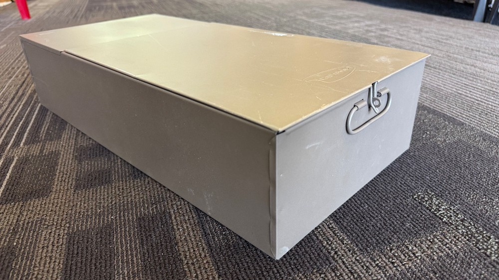 Multiple sizes and colors of vintage metal safe deposit boxes from the building's original vault.