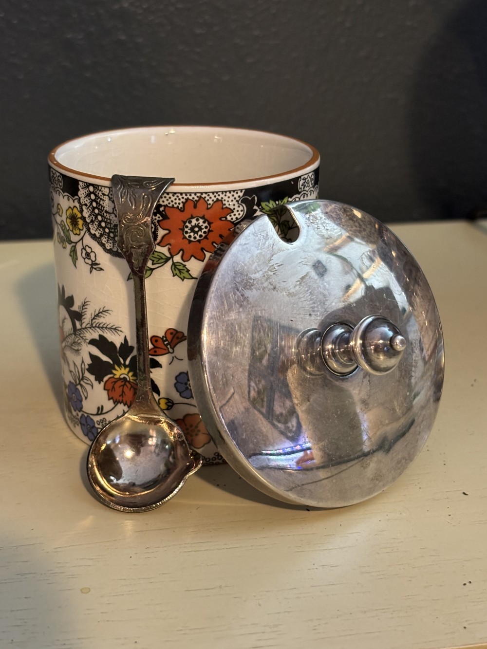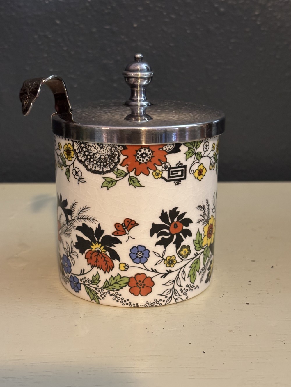 Vintage Royal Norfolk Staffordshire jam or mustard pot with silver-plated lid and matching spoon. Features a colorful chinoiserie-style floral pattern. No chips or cracks; light age crazing and normal plate wear. Bright, decorative piece and complete with lid and spoon.